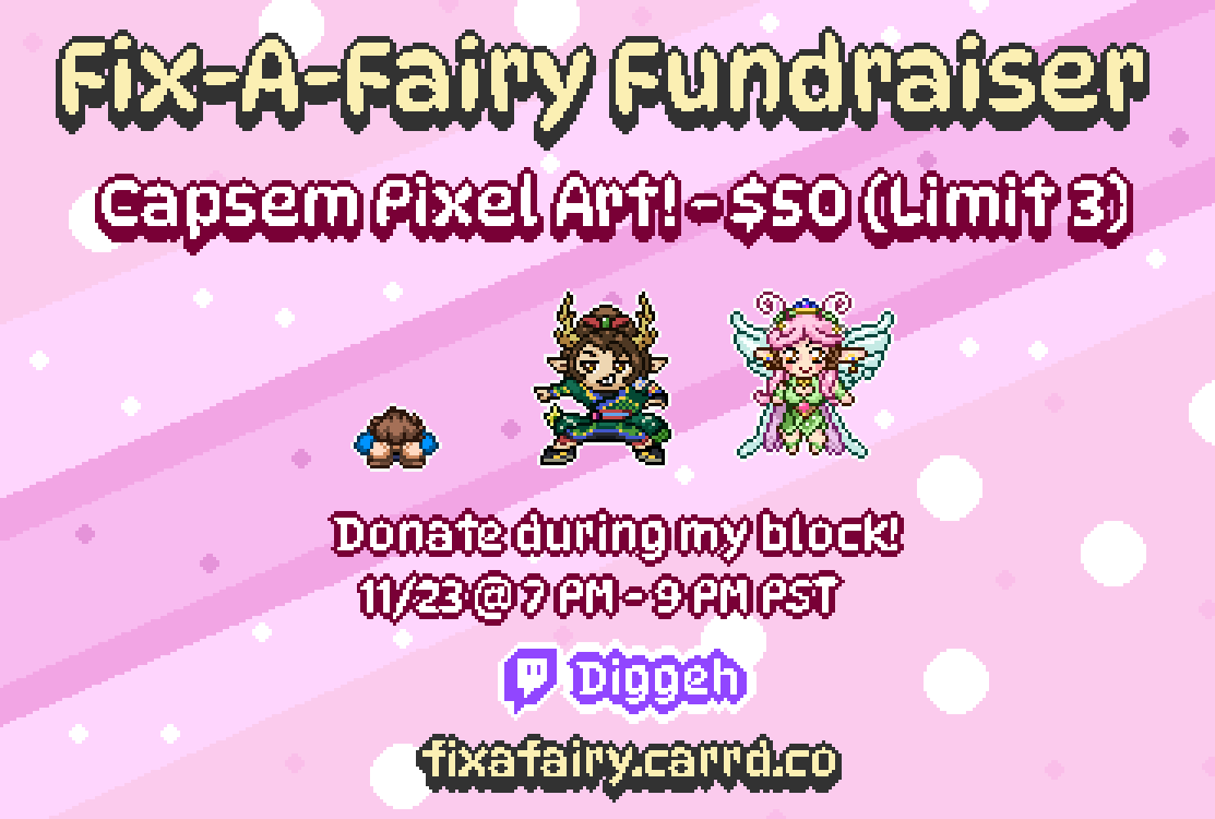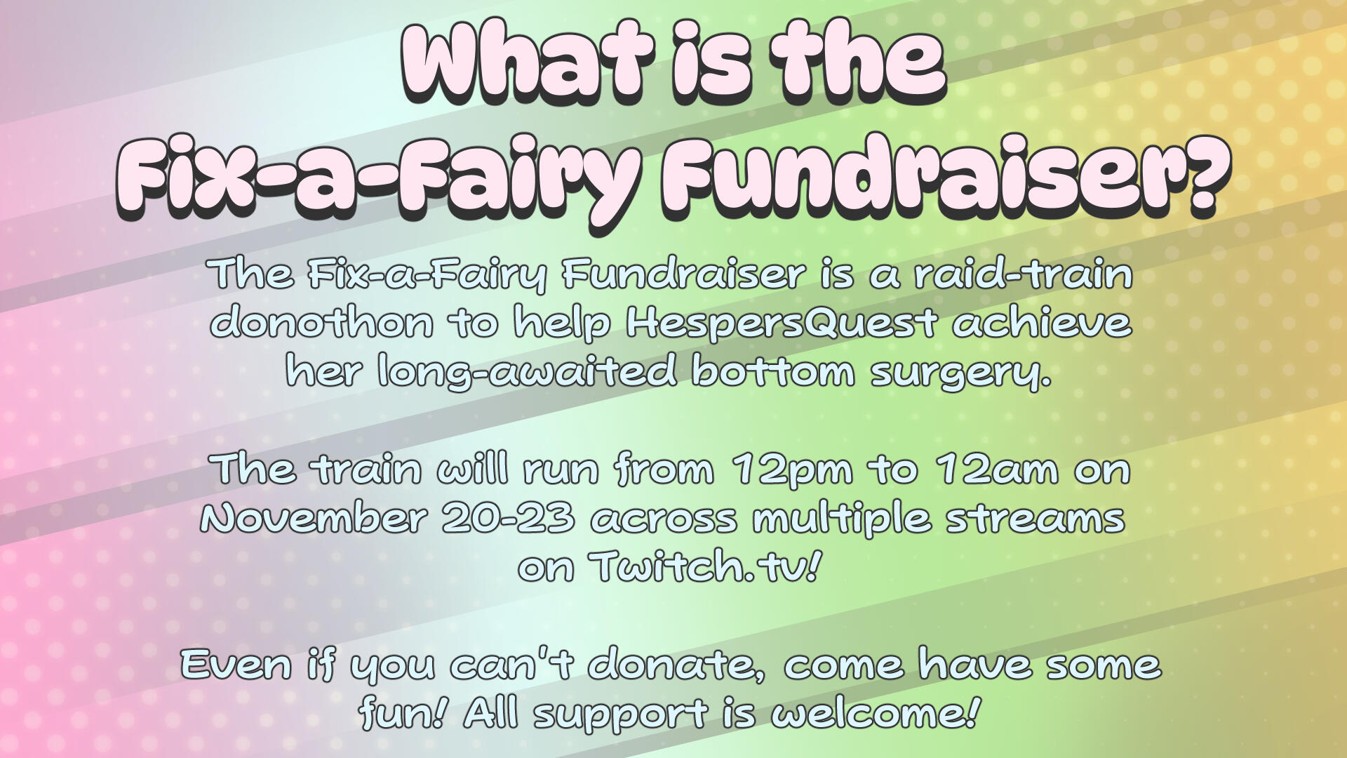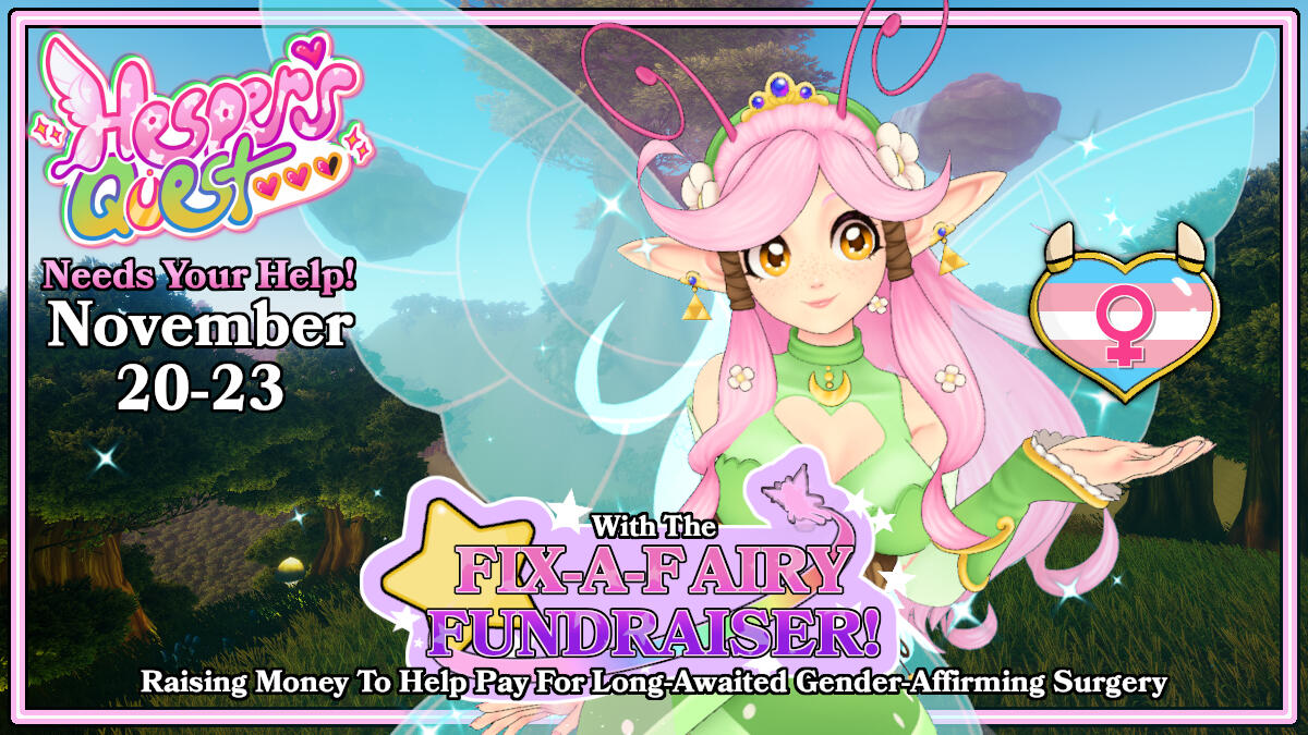 The Fix-a-Fairy Fundraiser is a raid-train donothon to help HespersQuest achieve her long-awaited bottom surgery.