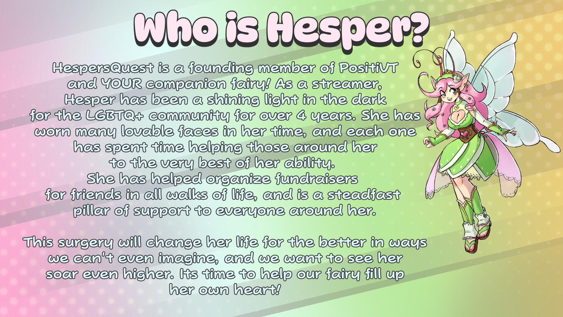 HespersQuest is a founding memeber of PositiVT and YOUR companion fairy! As a streamer, Hesper has been a shining light in the dark for the LGBTQ+ community for over four years. She has worn many lovable faces in her time, and each one has spent time helping those around her to the very best of her ability.